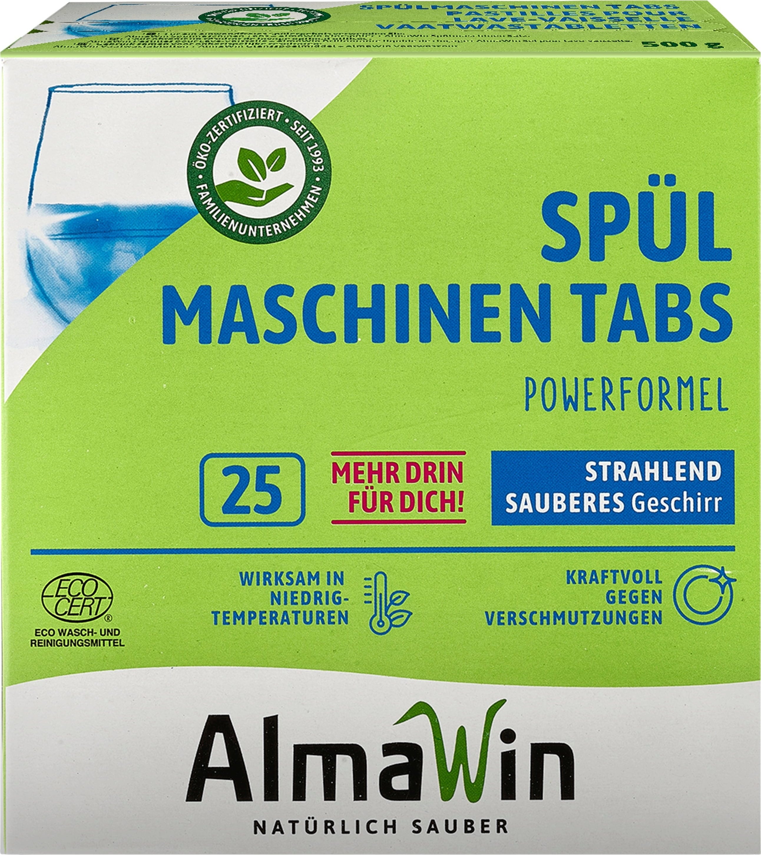 Le tabs AlmaWin sono realizzate con materie prime naturali e sono adatte a tutte le lavastoviglie domestiche. Sebbene non contenga fosfati, cloro, enzimi e OGM, la formulazione lava alla perfezione le stoviglie, rimuovendo residui ostinati e depositi di grasso, di amido e di proteine.