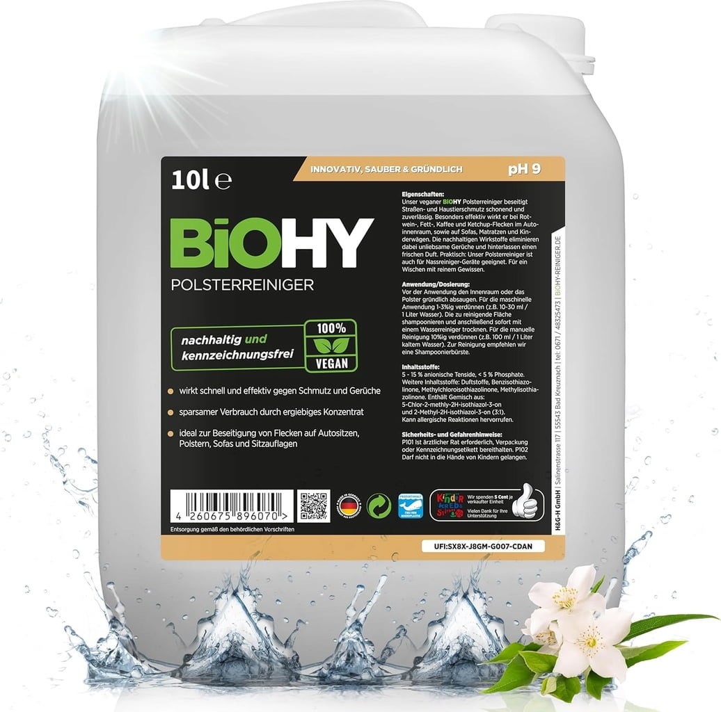 Questo detergente per imbottiture offre una vasta gamma di applicazioni. Con la sua formulazione vegana e biodegradabile, rimuove macchie di acqua, residui di cibo, olio e vino da divani, materassi, copriauto, poltrone, federe e tanto altro. Elimina anche gli odori sgradevoli, come ad esempio quelli degli animali domestici, lasciando un fresco profumo di gelsomino.