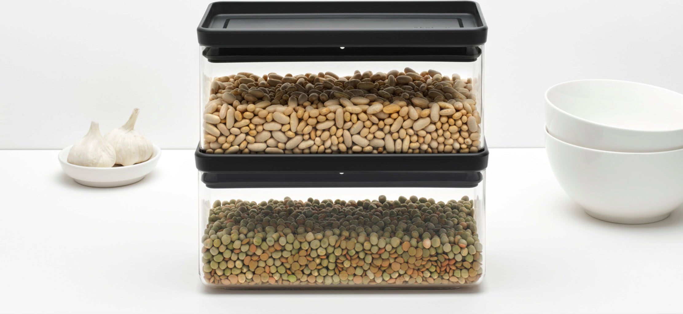 I contenitori in plastica trasparente della serie Tasty+ di Brabantia ti permettono di tenere in ordine la dispensa portando un tocco di eleganza. I barattoli sono disponibili in diverse dimensioni e sono impilabili per risparmiare spazio. Essendo trasparenti, puoi vedere facilmente cosa contiene ogni barattolo, mentre il tappo con guarnizione in silicone mantiene a lungo la freschezza degli alimenti.