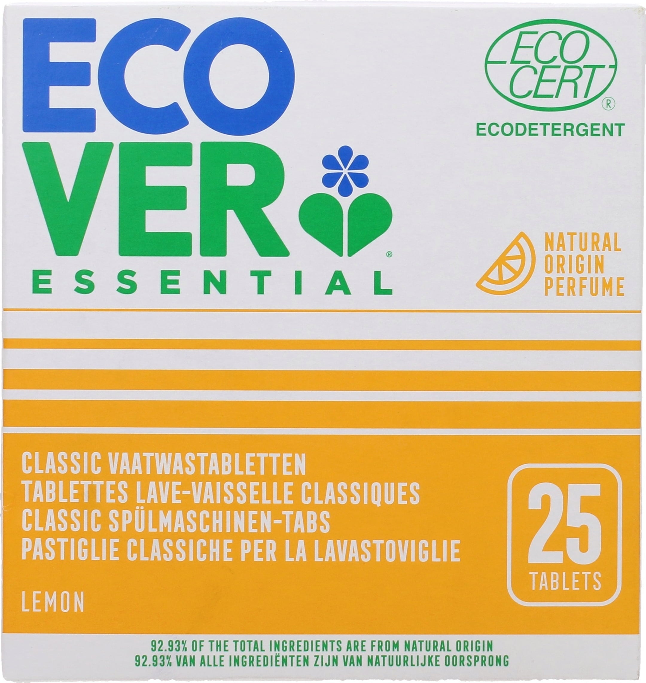Le pastiglie per lavastoviglie di ecover sono caratterizzate da un elevato potere pulente a base di ingredienti vegetali e minerali. Il fresco profumo agrumato proviene da fragranze naturali.