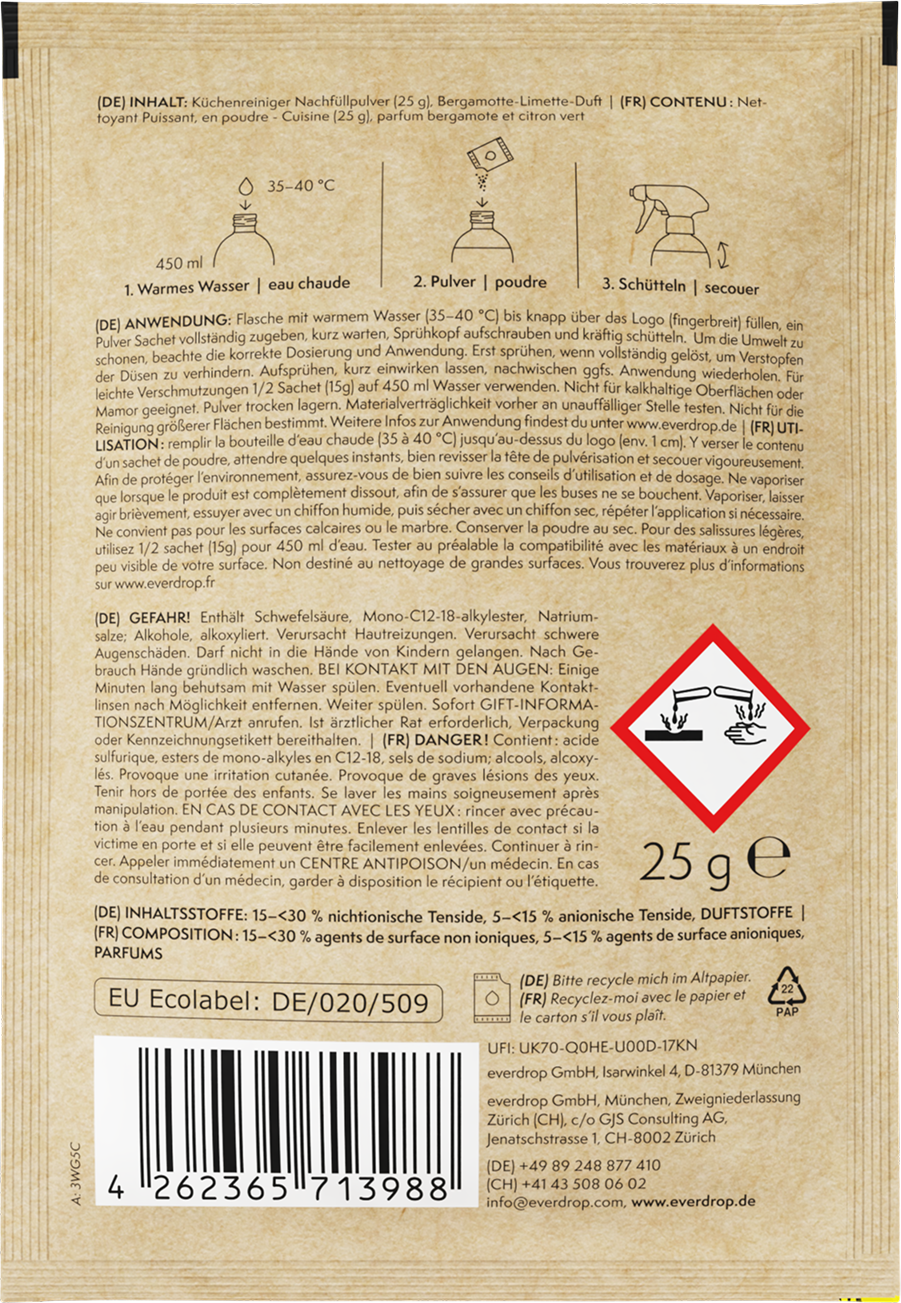 Questo detergente in polvere è ideale per la pulizia della cucina e del frigorifero. Gli ingredienti naturali sono ideali per tutte le superfici a contatto con gli alimenti e rimuovono il grasso e i residui. Inoltre, il detergente emana un profumo delicato di bergamotto e di lime.