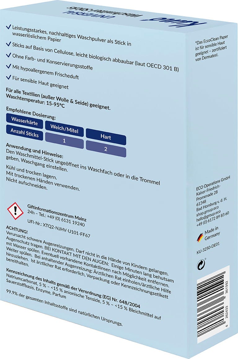 Il detersivo in stick è un'alternativa concentrata e compatta ai tradizionali prodotti in polvere e liquidi, offrendo un'azione detergente efficace. La composizione è priva di coloranti e conservanti ed è completamente biodegradabile. Gli stick sono adatti a tutti i tessuti, ad eccezione di lana e seta. Il prodotto ha una profumazione fresca ed è ipoallergenico ed è quindi adatto anche alle pelli sensibili.
